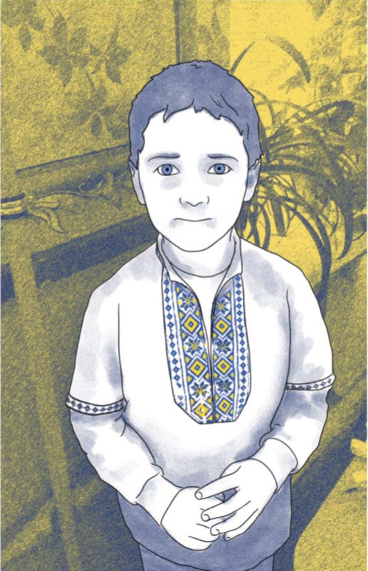 Ця ілюстрація створена на основі світлини хлопчика, зробленої його вчителькою 16 лютого 2022-го — тоді у школі святкували День національної єдності. Через вісім днів російська армія вторглася на територію України. Олешки опинилися у центрі активних бойових дій уже в перший день великої війни.